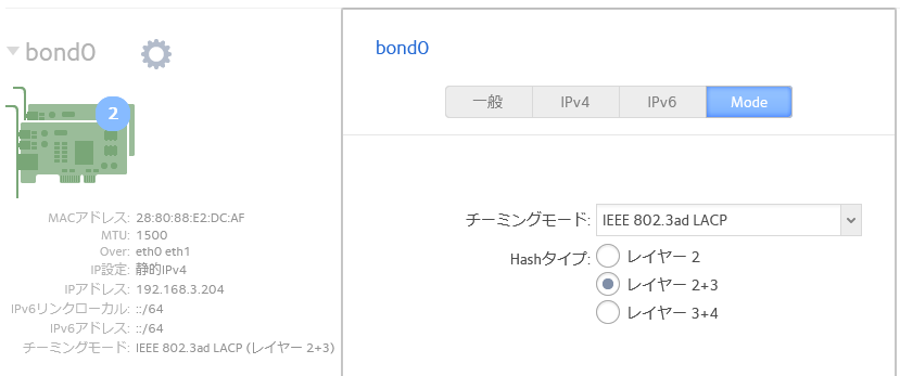 最初に面倒そうなNICの冗長化、LACPにして、L2SW側もPort-channel組ます。