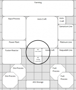 左下のOre-Processのエリアでは、真ん中のAE2 Core Contorolと、下のAE2-Storageからの配線が混在していて、一見して判断しづらい状況。
